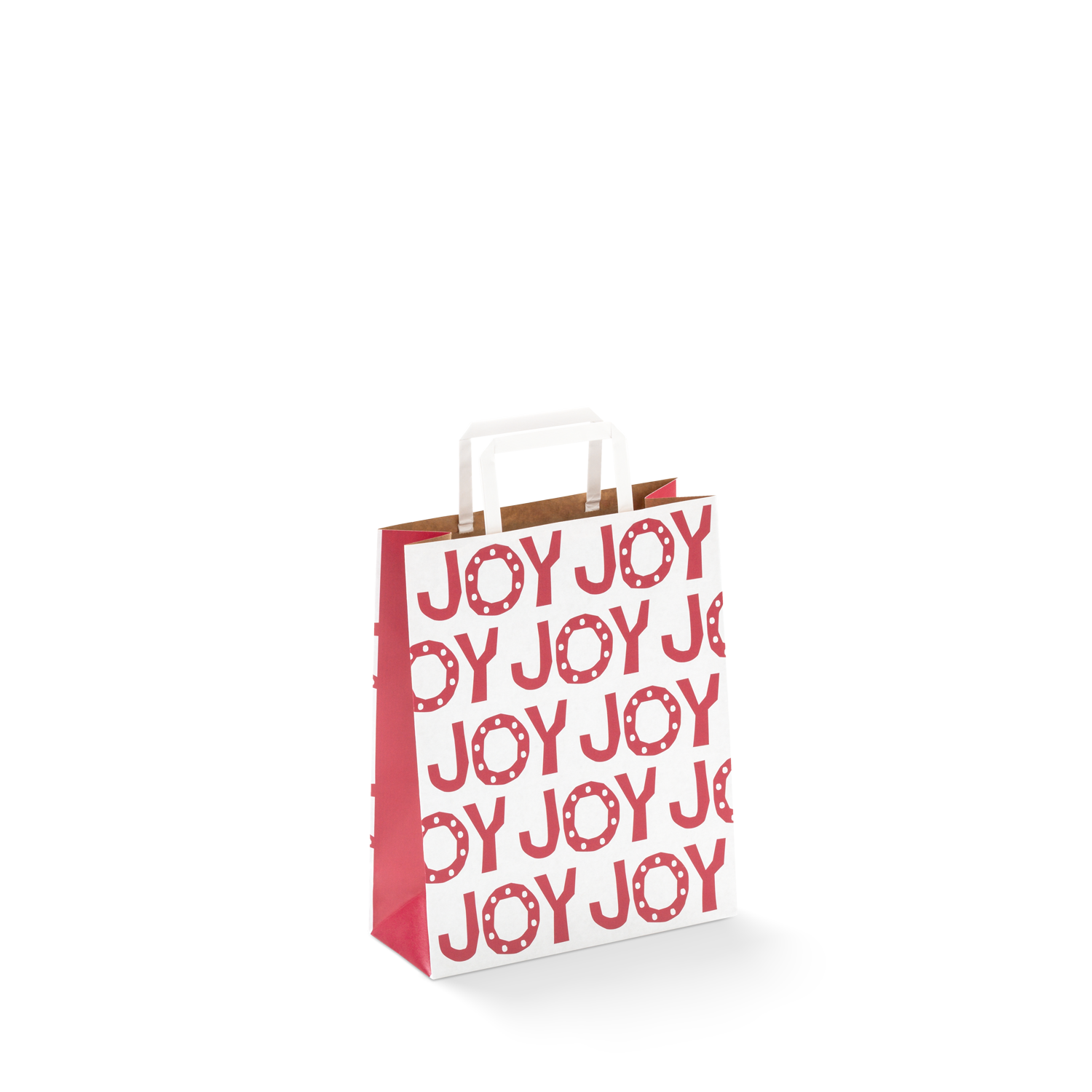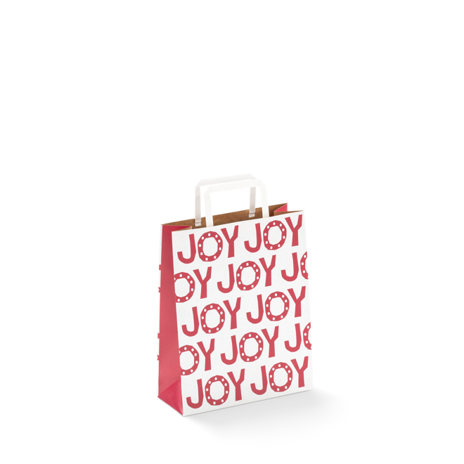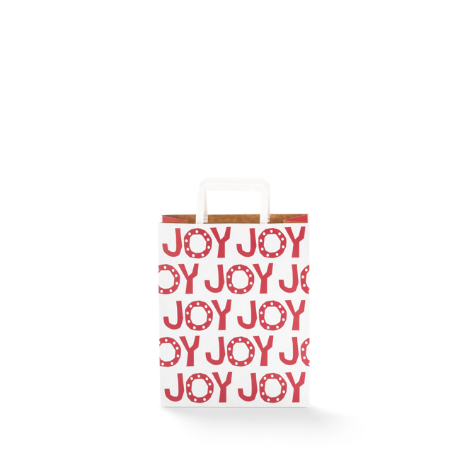The Medium Christmas Paper Bag #60 is made from high-quality duo kraft paper, featuring a 'Joy' Christmas design in red and white. These Christmas paper bags with flat fold handles is an excellent choice for business owners and retailers looking for style and sustainability. Our medium size paper bags are perfect for pair of jeans, hair care products, flyers, small homewares and more.