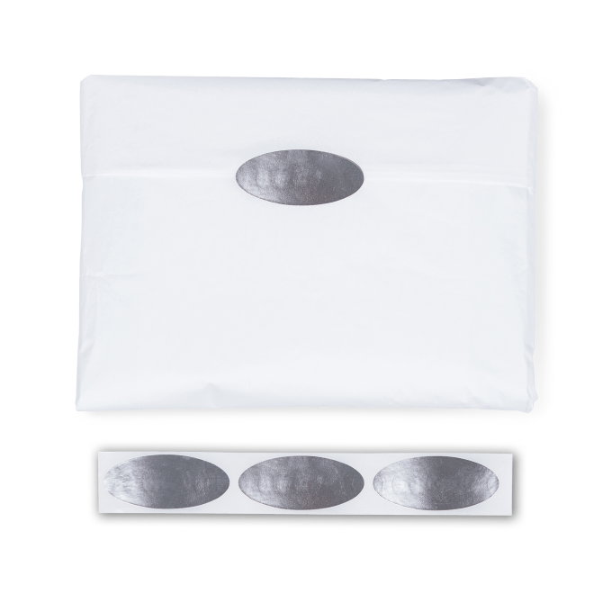High quality oval-shaped labels, easy to store and use from reels in handy dispenser box, and metallic silver finish